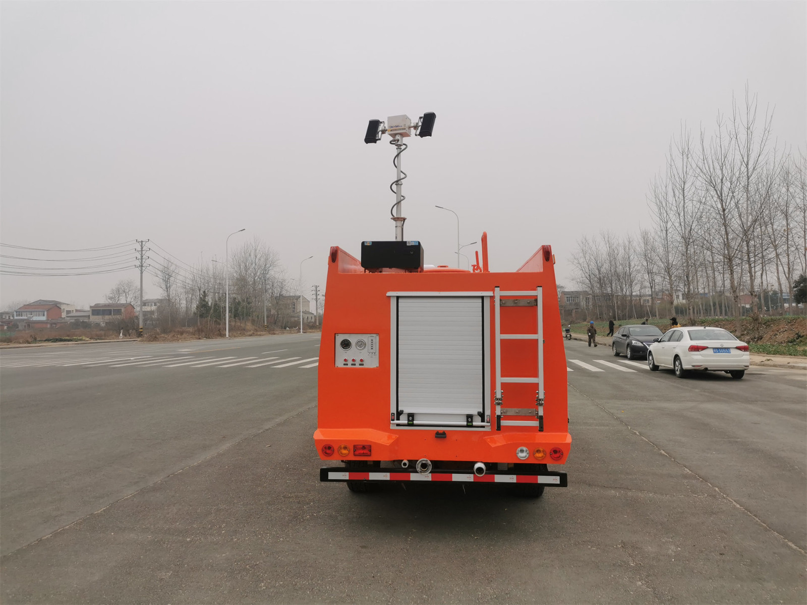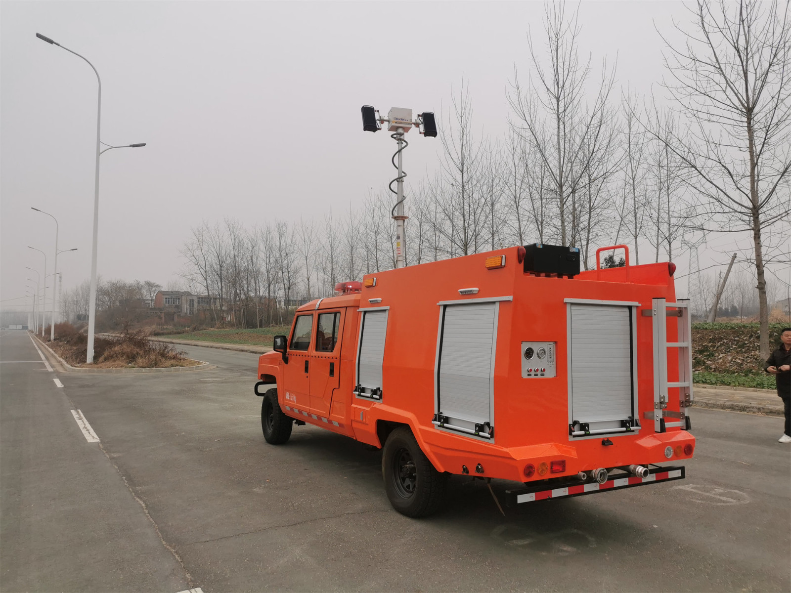 15、駕駛室頂部設有長排警燈,并配有喊話器